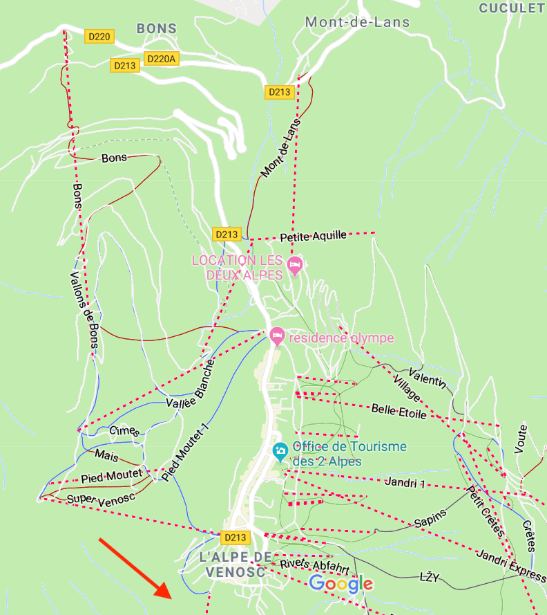 Wandel dus naar het einde van het dorp, lang het rond puntje met de Polar Bear op de hoek (een aanrader voor rustige après ski) nog verder het dorp uit, tot waar de pijl staat getekend op onderstaand kaartje. Je kan ook de pijlen in het dorp volgen richting Venosc. Er is een dalliftje die je er kan nemen, Télécabine de Venosc.