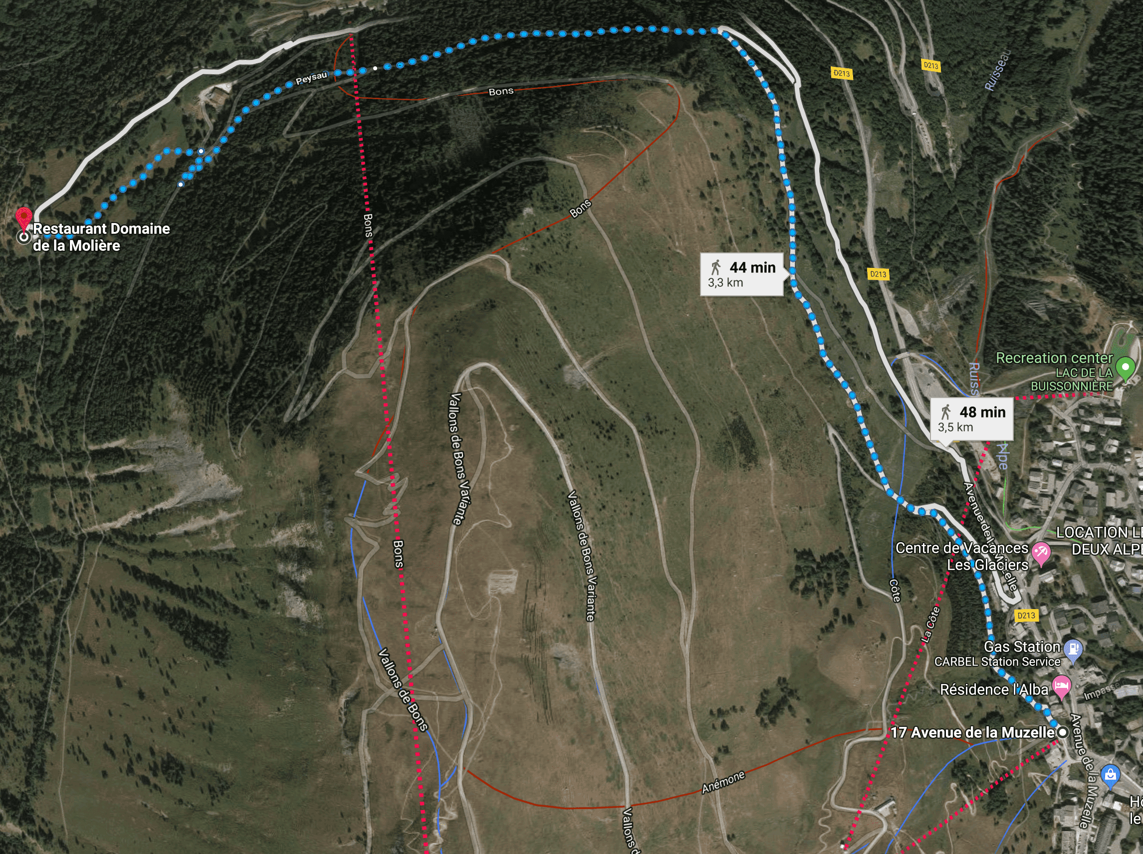 Van daaruit is er een leuke wandeling volledig naar beneden tot in het authentiek dorpje van Venosc. Het dorp zelf ligt op 800m hoogte, Les Deux Alpes op 1600, dus de tocht is 800 hoogtemeters op een afstand van 3,2 km. Het is dus een korte steile tocht. Reken toch op een uurtje voor de afdaling.